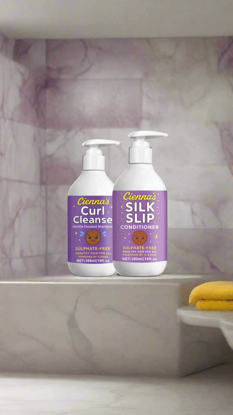 Make wash day stress-free! 💜 Cienna’s Wash Day Duo includes Curl Cleanse (gentle coconut shampoo) + Silk Slip (detangling conditioner) — the perfect pair for soft, tangle-free curls and a healthy scalp. Safe for little ones, gentle enough for sensitive hair, and powered by coconut oil for natural shine.